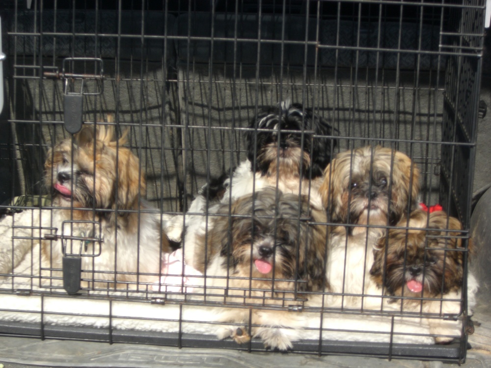 This is a picture of our five puppies on their way to their final series of shots in the summer of 2010. Little Bear is the black and white puppy in in the center rear. King Tut is in front. We sold the other three. |